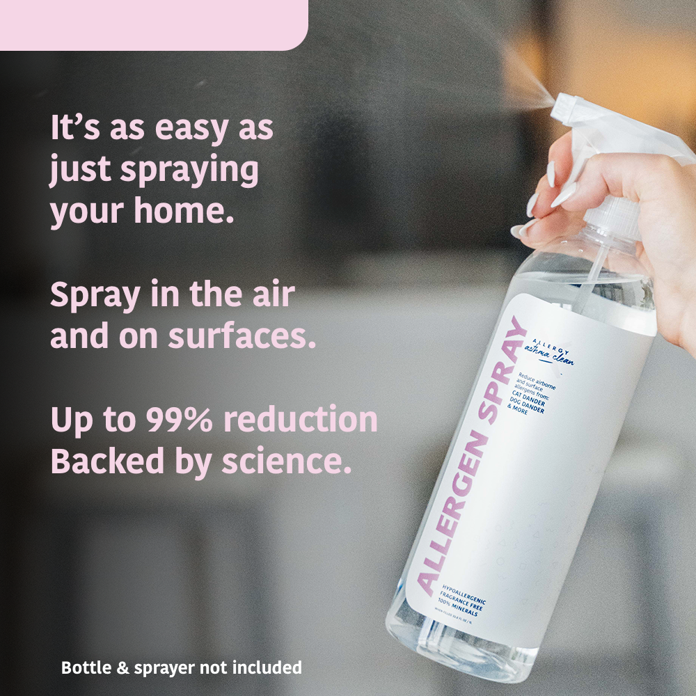 Allergen Spray addresses allergen proteins at the source with a 100% mineral-based formula—3rd-party lab verified to reduce up to 99%* of allergens on surfaces and up to 95%* in the air.